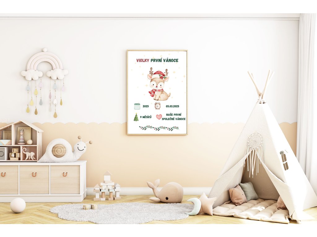 Zachyťte neopakovatelnou atmosféru **prvních Vánoc** vašeho miminka stylovým, ručně ilustrovaným plakátem. Personalizovaný motiv se stromečkem, pejskem a vánoční výzdobou doplníme o **jméno dítěte, rok, datum narození a věk** – vznikne tak jedinečná památka, která vám bude dělat radost každý rok znovu.