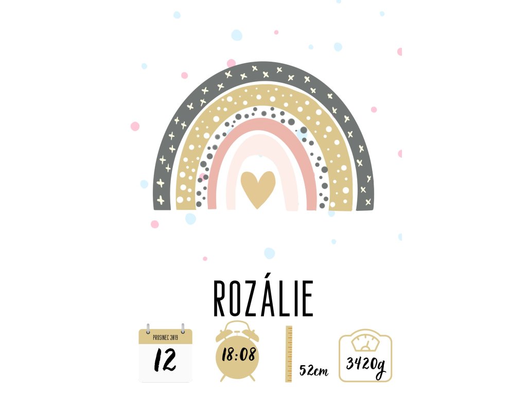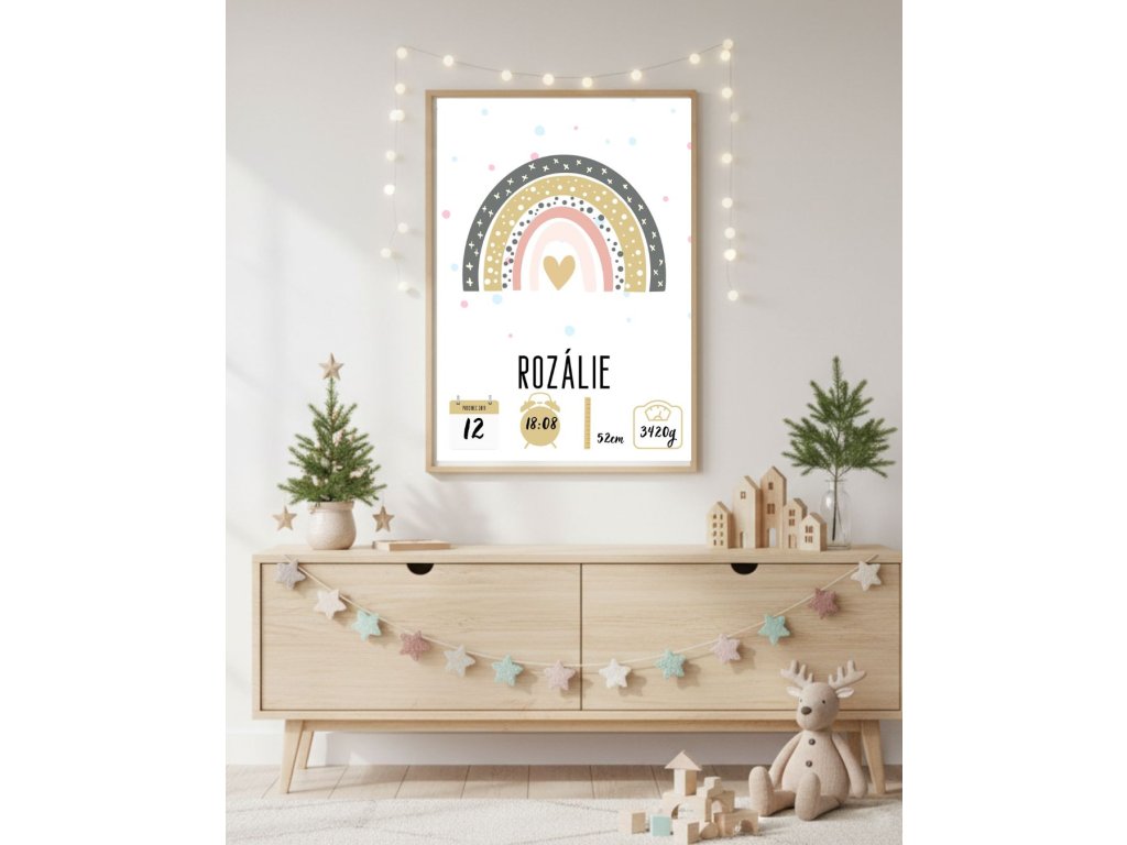 * **Kompletní personalizace:** Každý obraz je jedinečný. Zahrnuje jméno miminka, datum a přesný čas narození, délku a váhu při narození. Tyto údaje jsou elegantně zakomponovány do celkového designu.