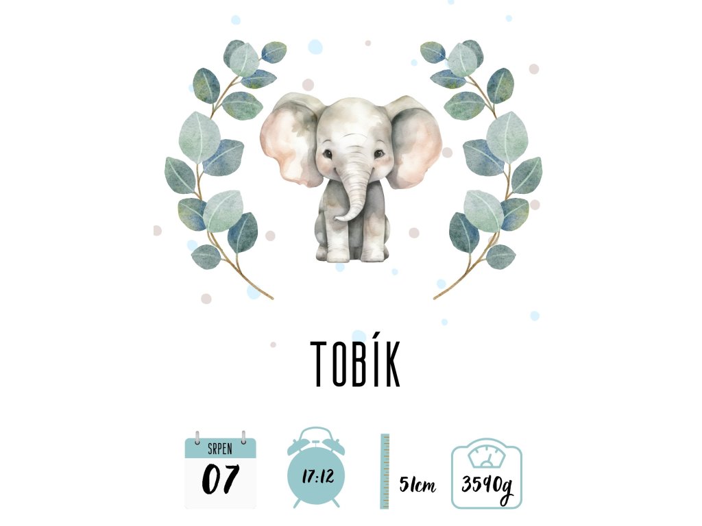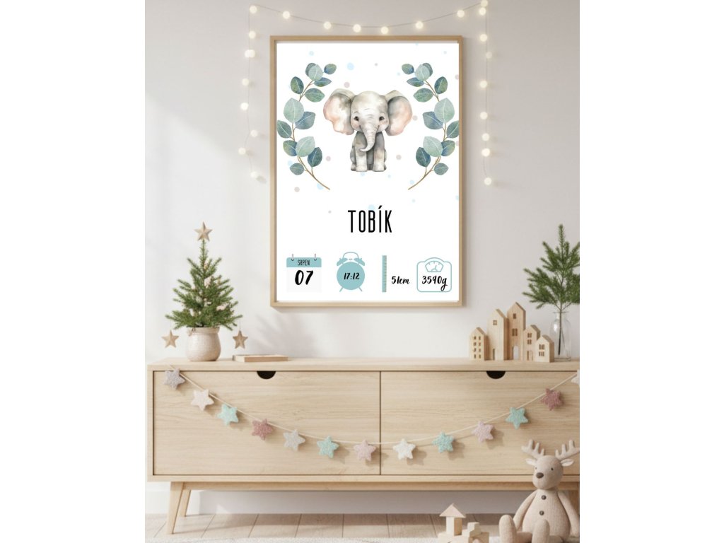 * **Kompletní personalizace:** Každý obraz je jedinečný. Zahrnuje jméno miminka, datum a přesný čas narození, délku a váhu při narození. Tyto údaje jsou elegantně zakomponovány do celkového designu.